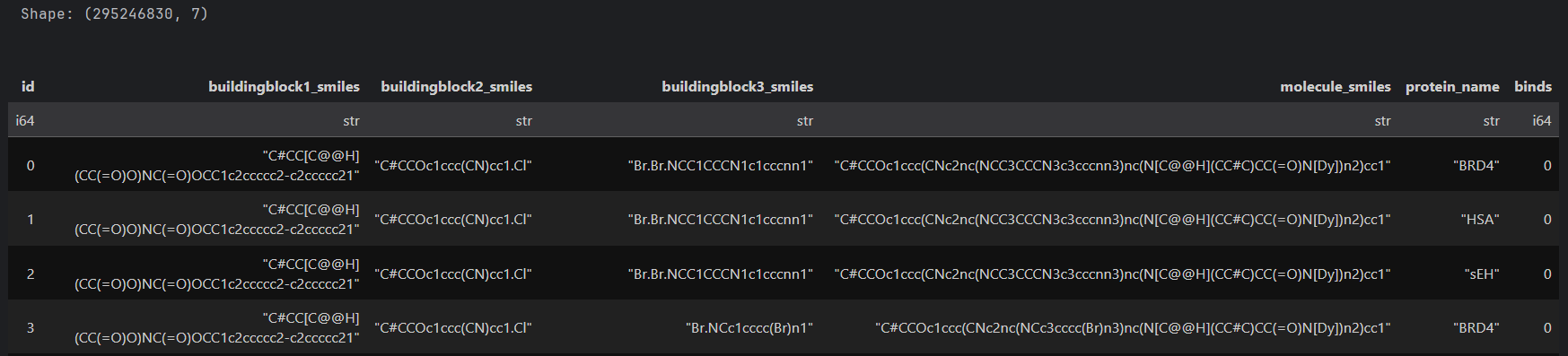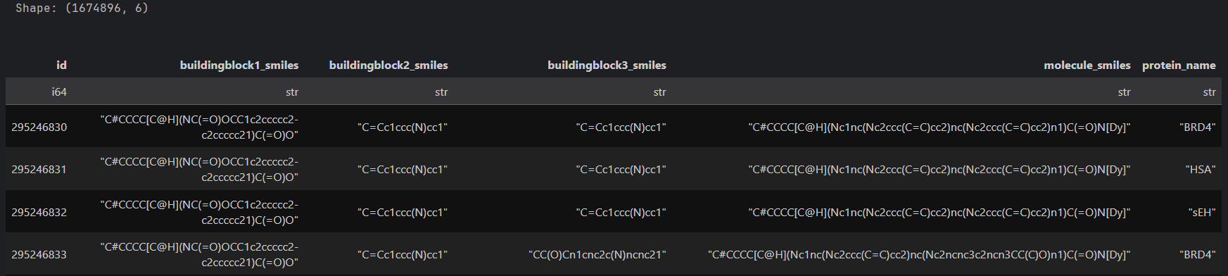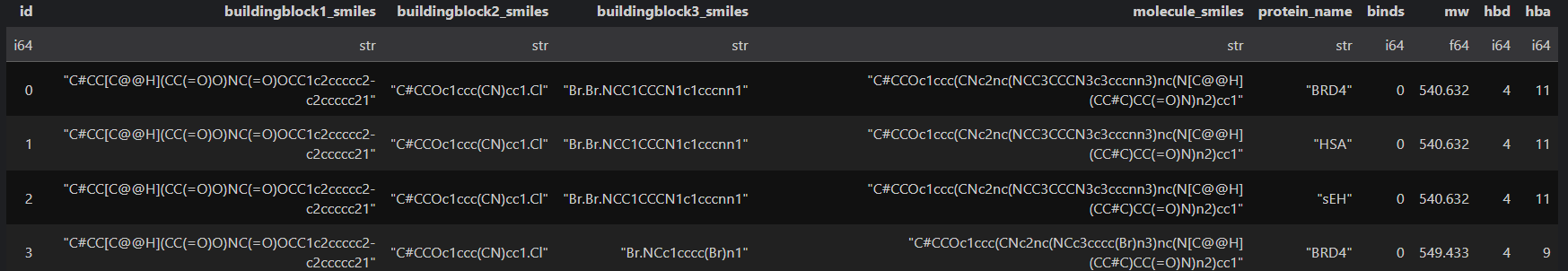 id for every row and three SMILES code columns for the building blocks (buildingblock_smiles, SMILES is a computer-readable format